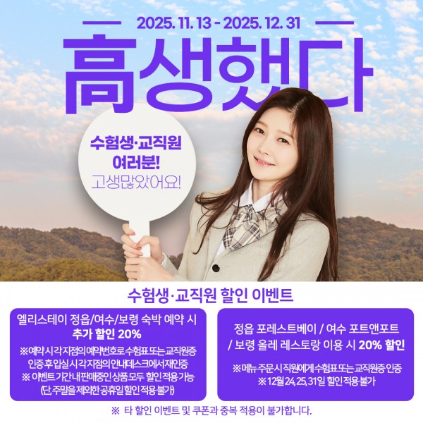 11월 13일부터 12월 31일까지 예약 시 수험표를 인증해주시면 엘리스테이 객실 요금이 20% 할인 되며 각 지점의 레스토랑에서도 20% 할인된 금액으로 이용하실 수 있습니다!